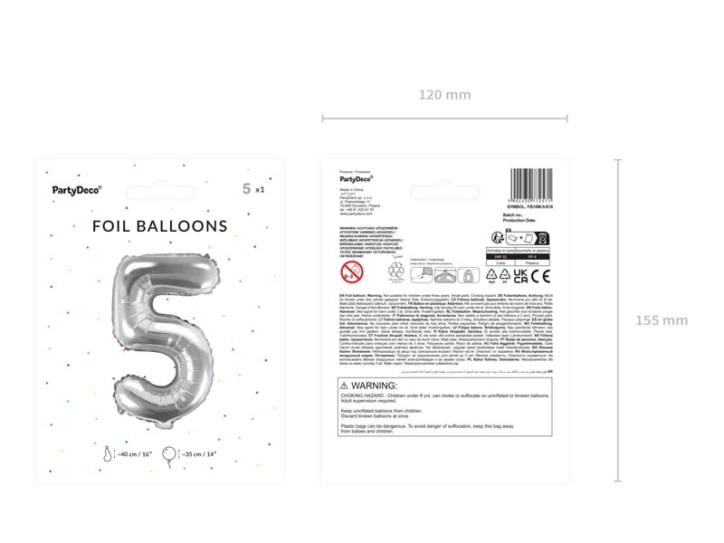 Balon foliowy metalizowany Cyfra ''5'' w kolorze srebrnym, rozmiar przed napompowaniem ok. 40 cm (16''), rozmiar po napompowaniu ok. 35 cm (14''). Do napomowania powietrzem.