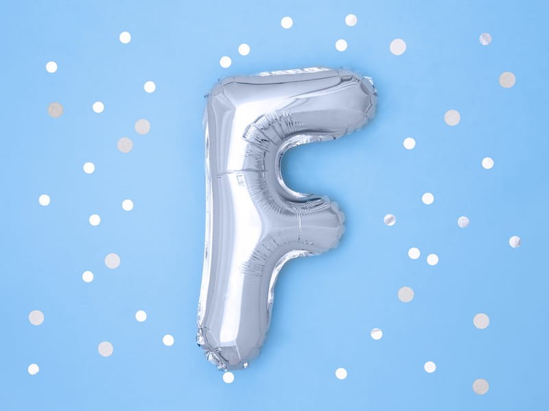 Balon foliowy metalizowany Litera ''F'' w kolorze srebrnym, wysokość przed napompowaniem ok. 40 cm (16''), wysokość po napompowaniu ok. 35 cm (14''). Do napomowania powietrzem.