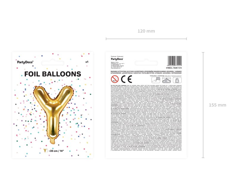 Balon foliowy metalizowany Litera ''Y'' w kolorze złotym, wysokość przed napompowaniem ok. 40 cm (16''), wysokość po napompowaniu ok. 35 cm (14''). Do napomowania powietrzem.