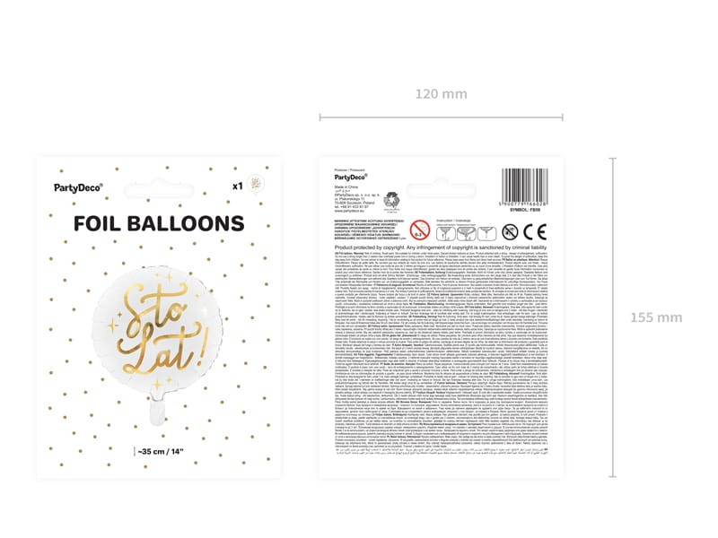 Matowy balon foliowy w kolorze białym ze zlotym metalizowanym napisem Sto lat, średnica przed napompowaniem ok. 45 cm (18''), średnica po napompowaniu ok. 35 cm (14''). Do napompowania helem.