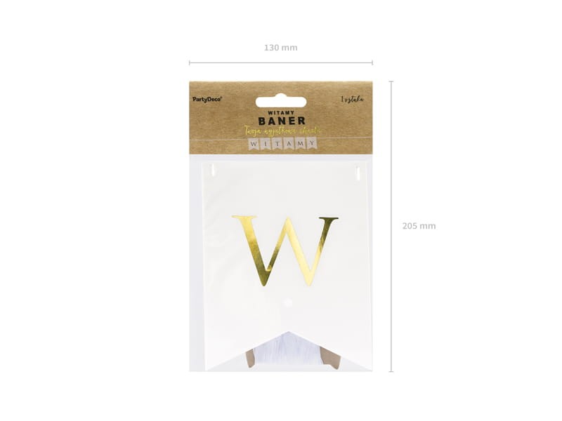 Baner w kolorze białym ze złotym napisem Witamy, do samodzielnego złożenia, zestaw zawiera literki i ok. 2,5 m białej tasiemki, wymiary po złożeniu: wysokość ok. 15 cm, długość ok. 80 cm.