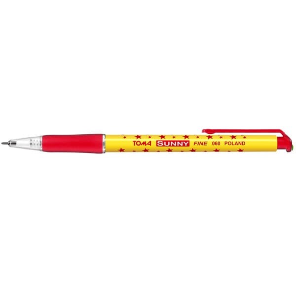 długopis Toma automatyczny Sunny TO-060, trwały mechanizm włączający, plastikowa obudowa w kolorze tuszu, ergonomiczny uchwyt, grubość końcówki 0.70 mm, wkład produkcji szwajcarskiej z tuszem gładko-piszącym, do pisania po wszystkich rodzajach papieru np. po odwrotnej stronie druków samokopiujących (faktur), dostępny w 4 kolorach: czarny, czerwony, zielony, niebieski, kolor wkładu: czerwony