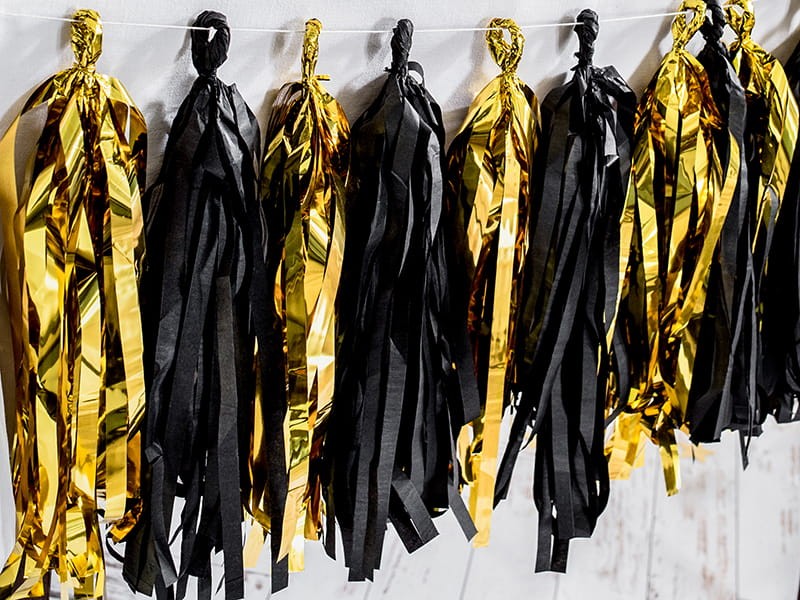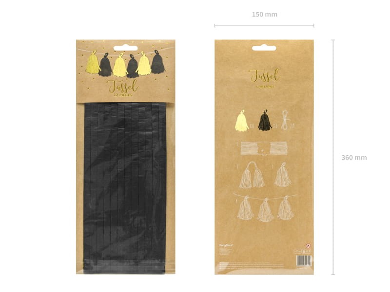 Girlanda frędzle, do samodzielnego złożenia, zestaw zawiera 12 frędzli (po 6 x złoty lustrzany, czarny) i ok. 2 m białego sznurka, wymiary po złożeniu: wysokość ok. 30 cm, długość ok. 1,5 m.