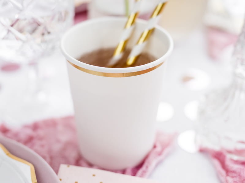 Kubeczki papierowe w kolorze białym ze złotymi brzegami, pojemność ok. 260 ml. Kubki na napoje zawierają oznaczenia wymagane przez Rozporządzenie wykonawcze Komisji (UE) 2020/2151 z dnia 17 grudnia 2020 r. ustanawiające zasady dotyczące zharmonizowanych specyfikacji w odniesieniu do oznakowania produktów jednorazowego użytku z tworzyw sztucznych wymienionych w części D załącznika do dyrektywy Parlamentu Europejskiego i Rady (UE) 2019/904 w sprawie zmniejszenia wpływu niektórych produktów z tworzyw sztucznych na środowisko. Produkt zawiera etykietę wyłącznie w języku polskim, niemieckim, czeskim, francuskim, niderlandzkim, słowackim, słoweńskim i bułgarskim. (1 op. / 6 szt.) 'Nowe regulacje UE dotyczące etykiet w kategorii papierowych kubeczków - obecnie nie dotyczą klientów z Polski.'
